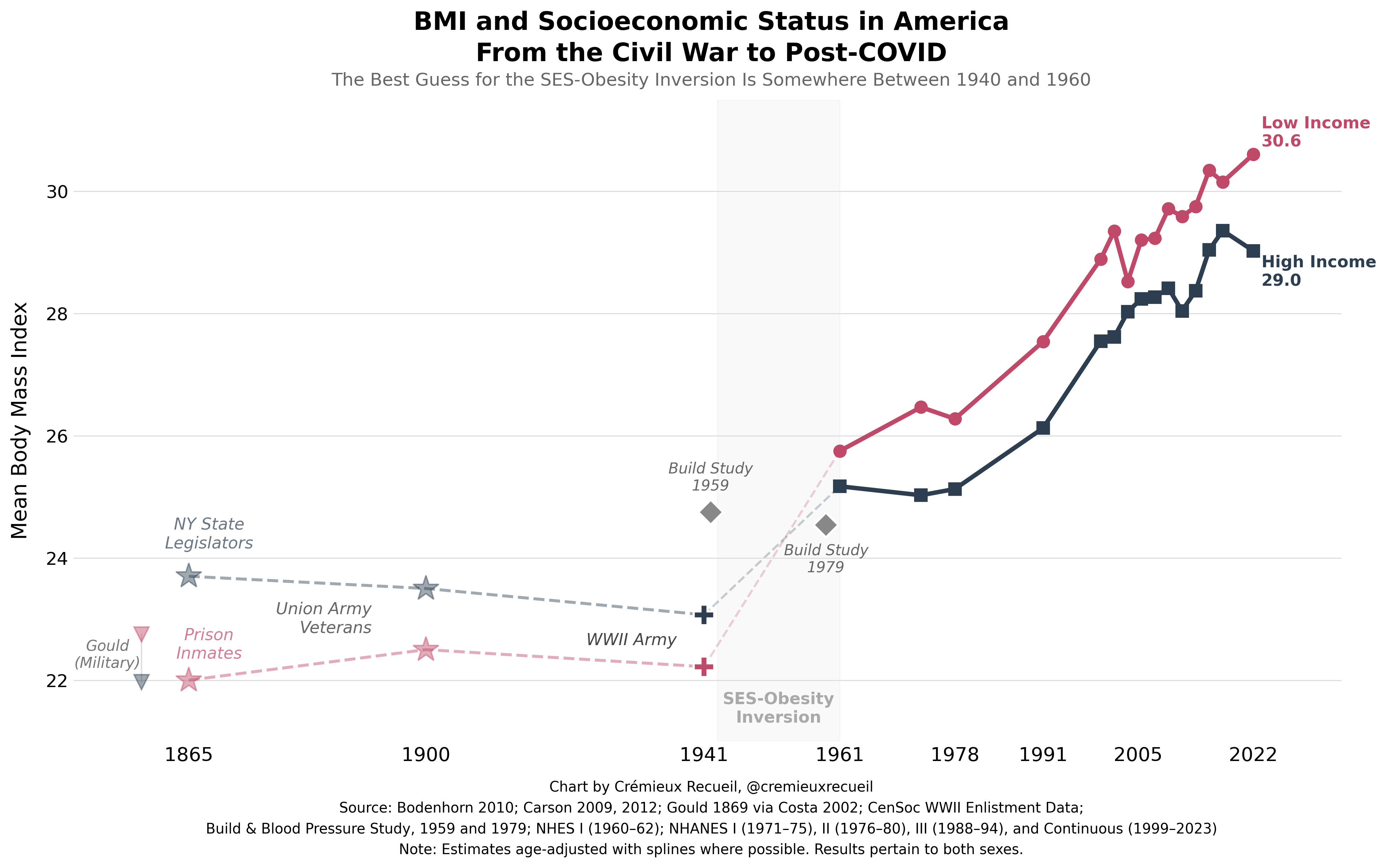 Before the era of representative cohort studies, there are various data points like estimates at the time of the draft for WWII, or estimates from Union Army veterans decades after the Civil War, and if we want to go even less population-representative, we can look at a comparison of legislators from New York and prisoners, and in that whole period, we see that the high-income are fatter than the low-income.3