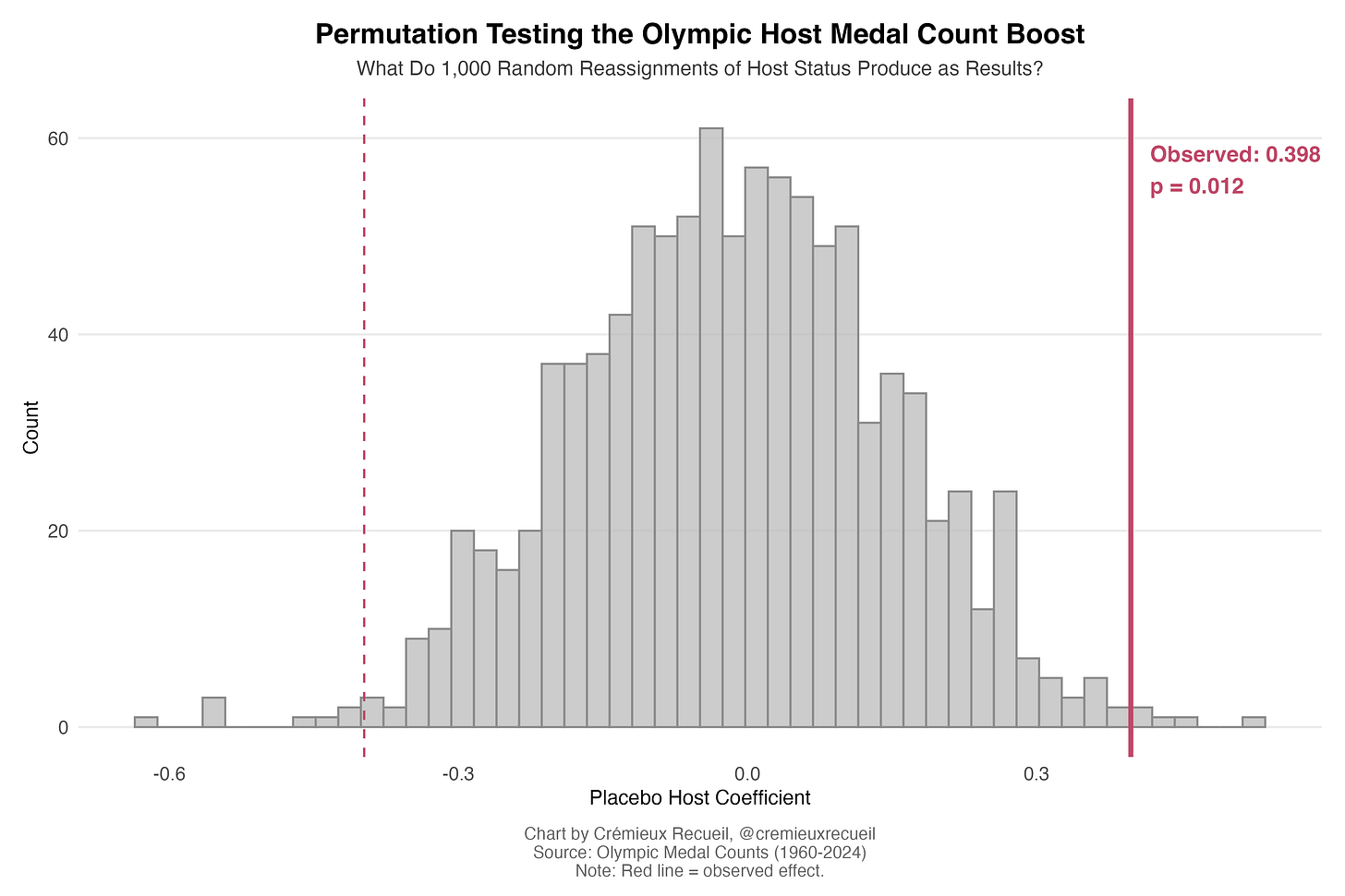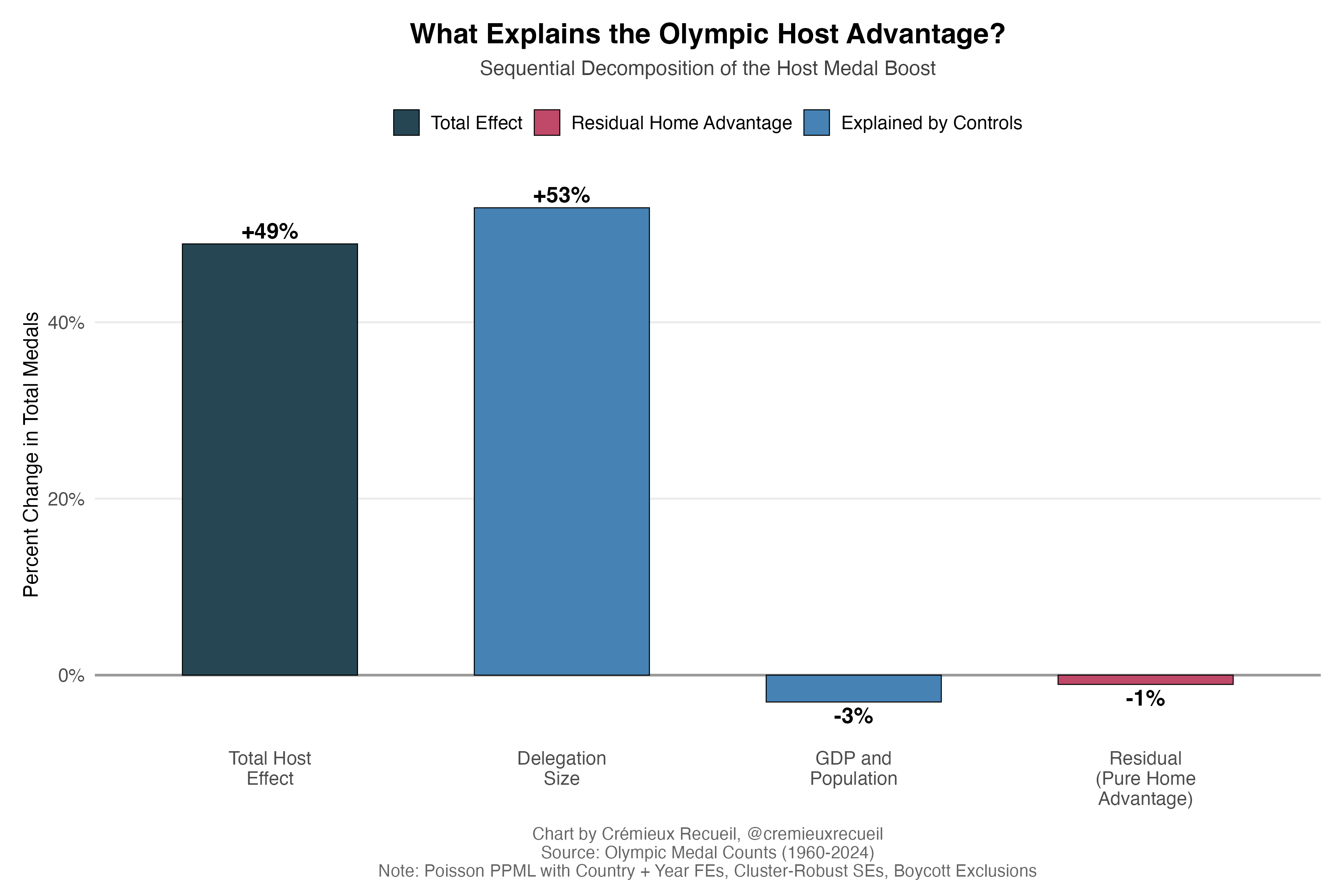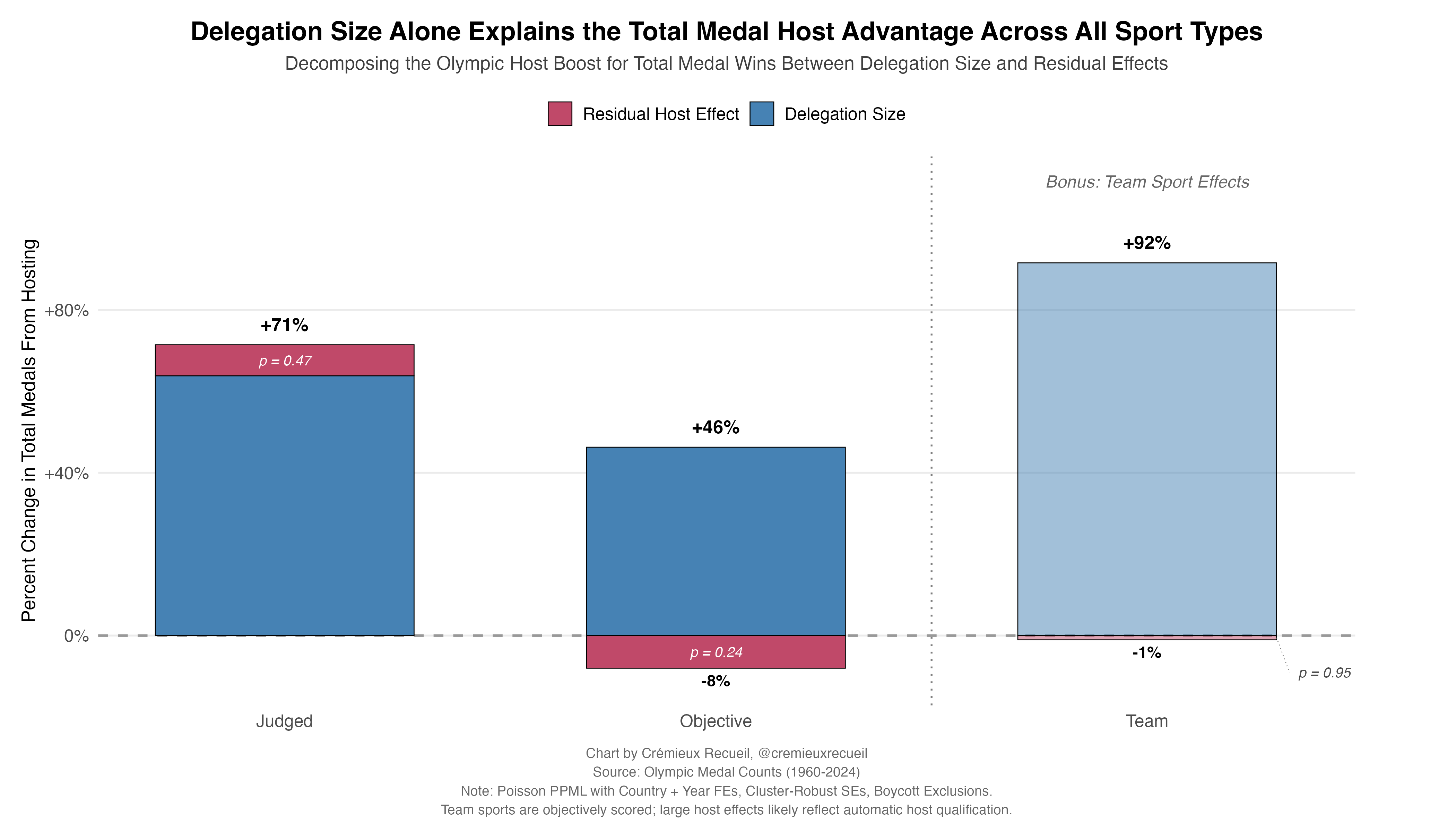 With just these variables in mind, we can decompose the host advantage6 and see that delegation size actually explains more than 100% of the host bonus! What this suggests is that hosting countries send a lot more athletes, but said athletes may not be as high-quality as the athletes they’d normally send, so they end up less successful on average, while bringing home more medals because they’re more numerous. Although, this residual is not significant, so let’s not make too much of it.