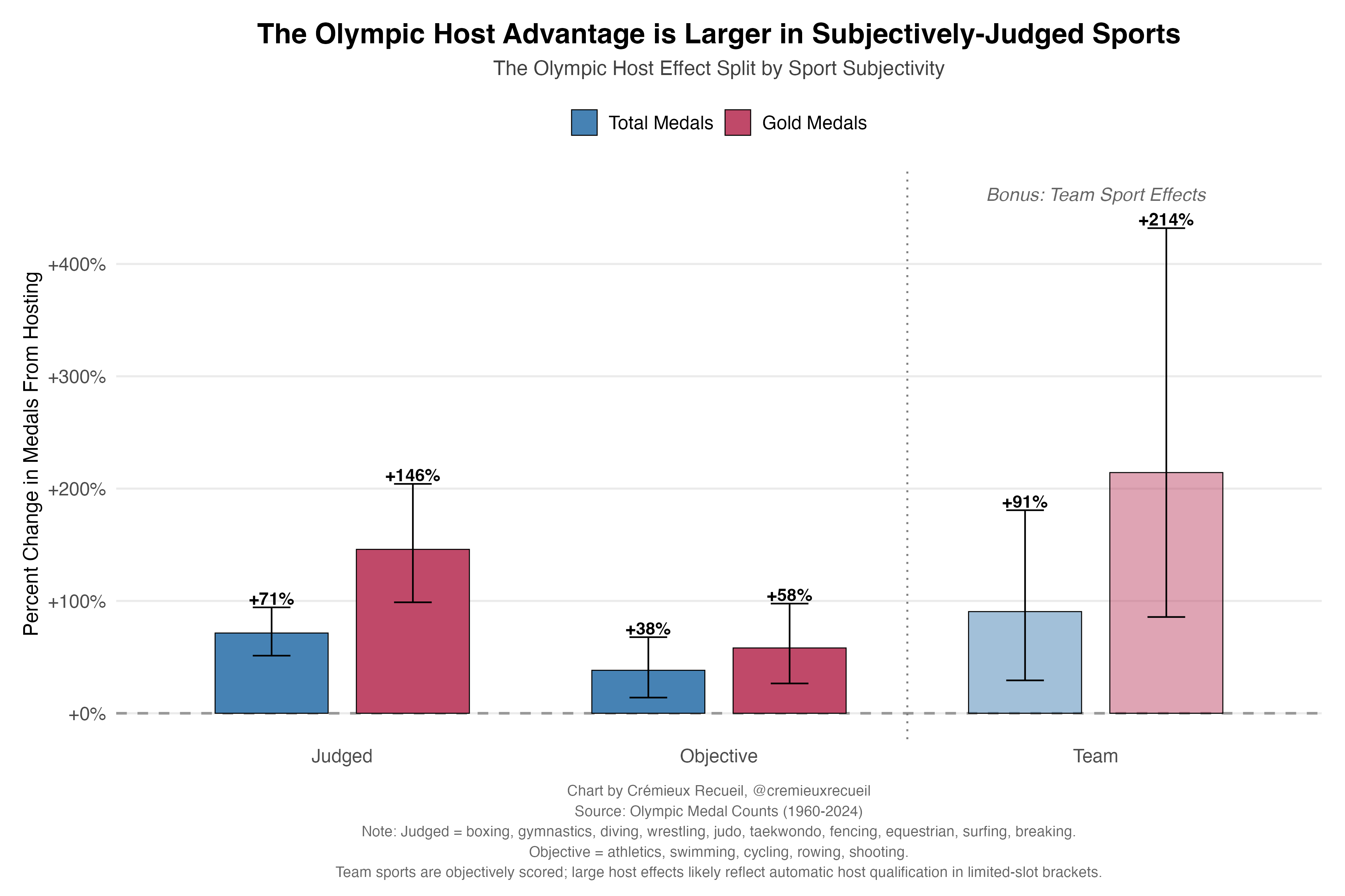 The real kicker for the Olympic host effect has to do with judging. The host, as it turns out, exerts considerable influence over two things that impact judging: for one, the judges themselves! For two, the crowds, as hosting countries get more seats for their countrymen at the events, and this might matter because there’s evidence home field advantages have to do with influencing people like referees.