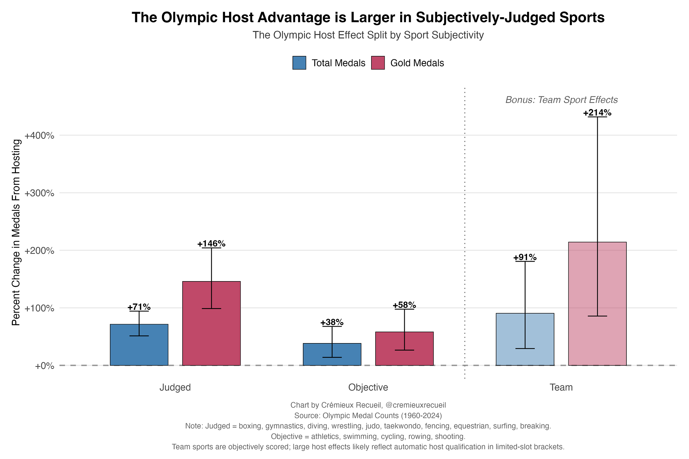 The reason Olympic hosts earn more medals at the Olympics is overwhelmingly because they send more athletes. The reason they earn more gold medals above and beyond sending more athletes is because they influence judges.12