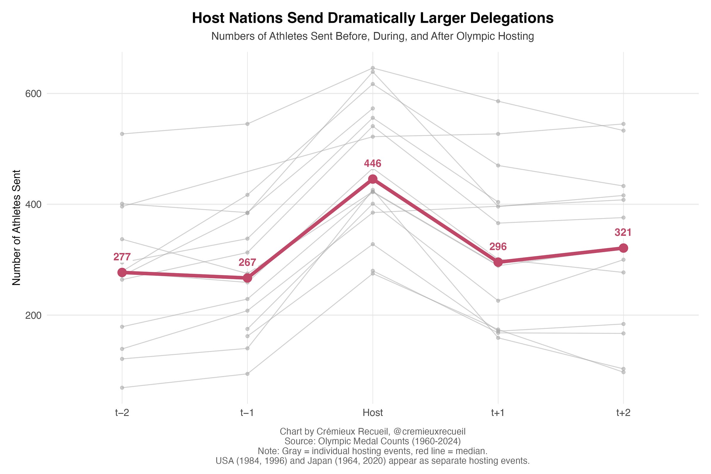 Consistent with this, hosting results in a huge bump to the number of athletes a country sends and then afterwards, they return to a more normal, but slightly elevated number in subsequent games.