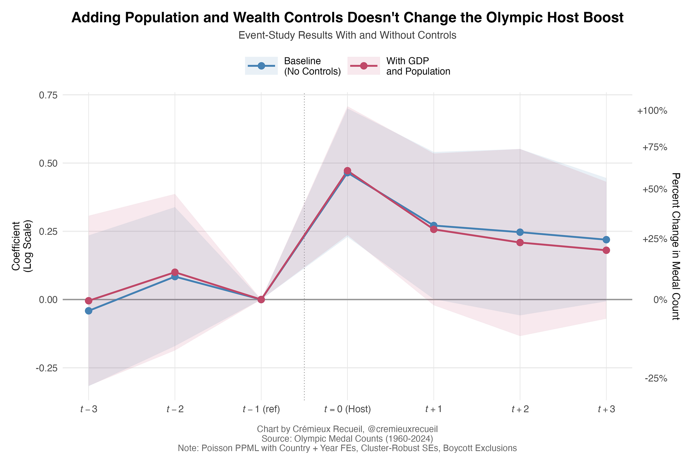 The effect is large, it is statistically significant, and it significantly fades, too. The effect is also robust to alternative specifications2 and it affects both total and gold medals.3 Does it hold when controlling for (World Bank 2015 US$) GDP Per Capita and population size?4 Yes! So those variables on their own are not what explains the host effect either:5