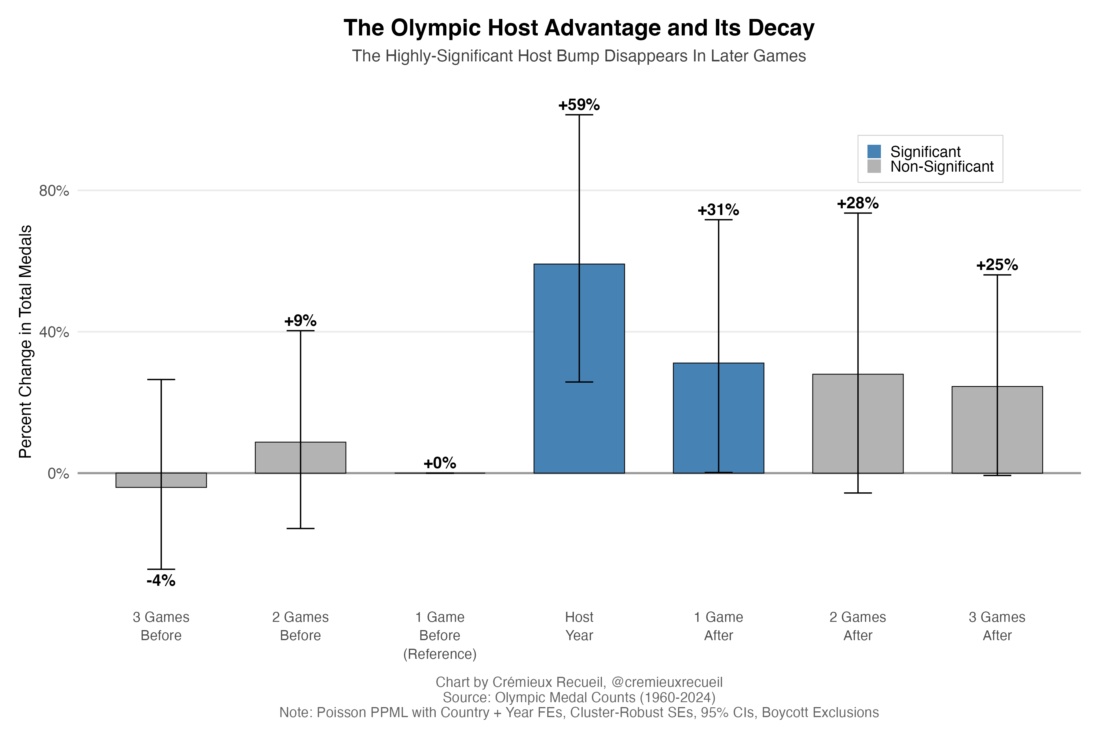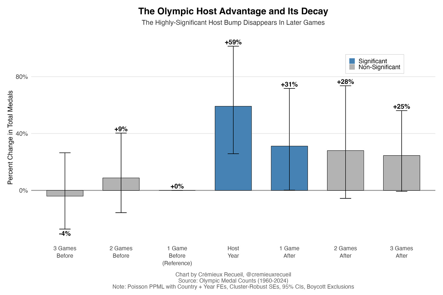 The Olympic host advantage is large, but it substantially fades out. There’s some room to think that hosting countries might invest more effort into finding and training athletes, but that’s unlikely to be all there is to this, since they don’t perform as well in subsequent games. We’ll have to dig deeper.