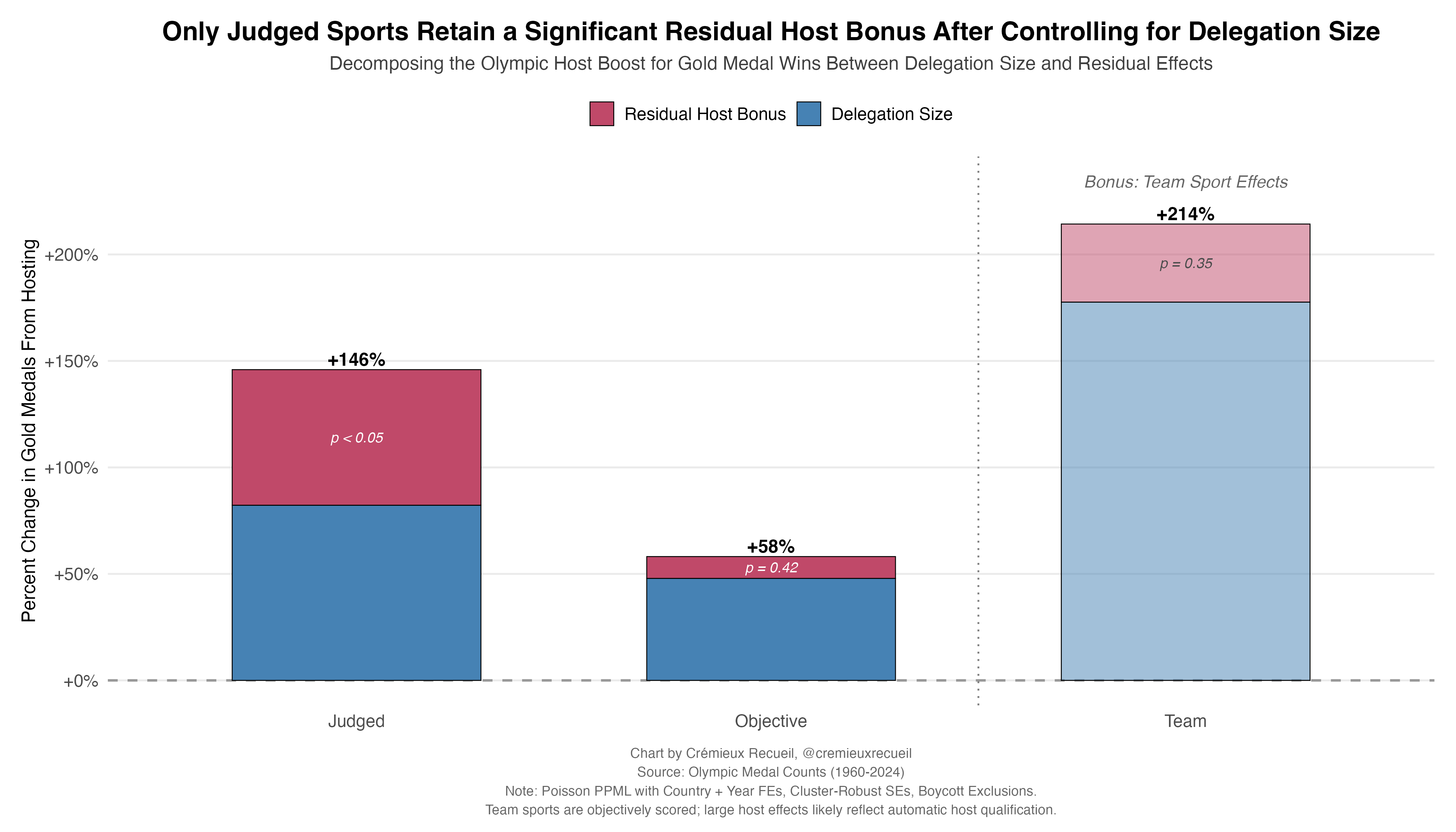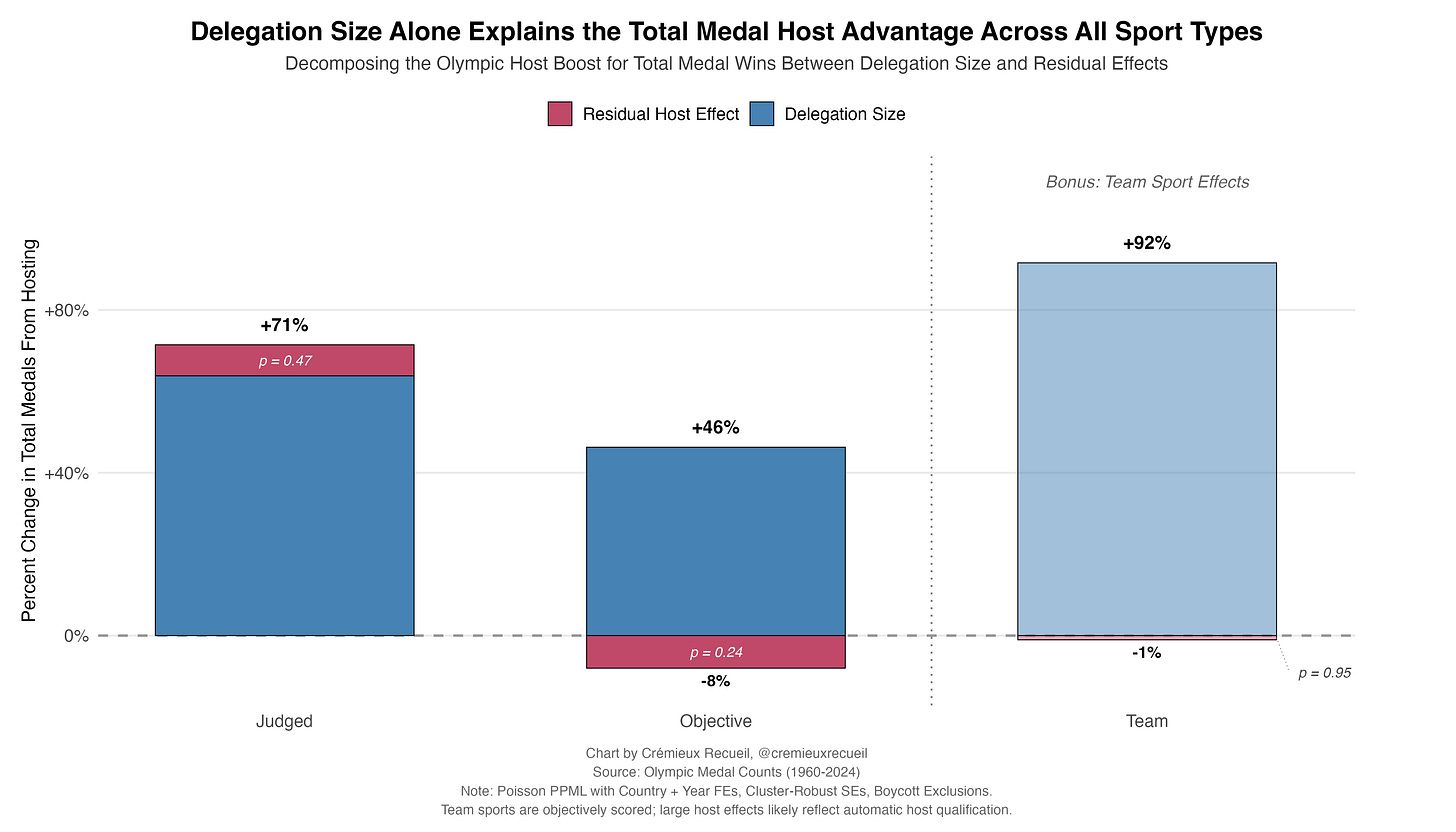 As it turns out, the answer has nothing to do with crowd size. The subjective-only boost Japan received—even net of its choice to add skateboarding and karate as events—was completely normal!8 Japan's delegation-residualized judged-sport bonus at the fanless Tokyo Games was statistically indistinguishable from the typical host's (p = 0.59), and the overall judged-sport residual remains highly significant (p < 0.001) even with Tokyo excluded.9 Whatever mechanism drives the subjective scoring advantage, it operates with or without a home-based crowd.