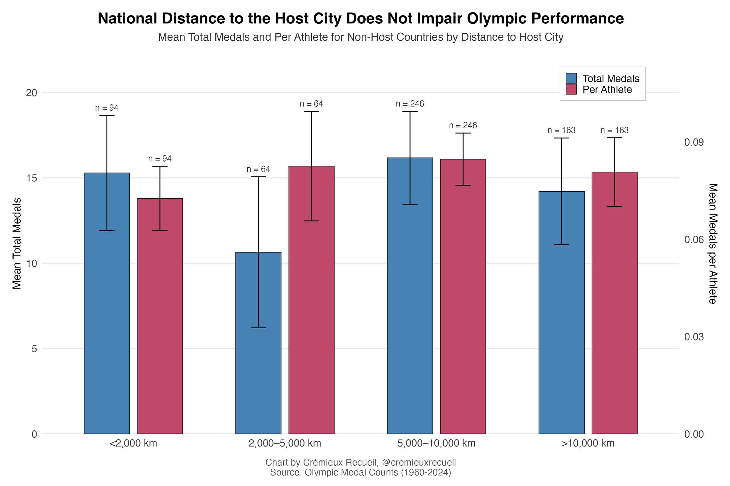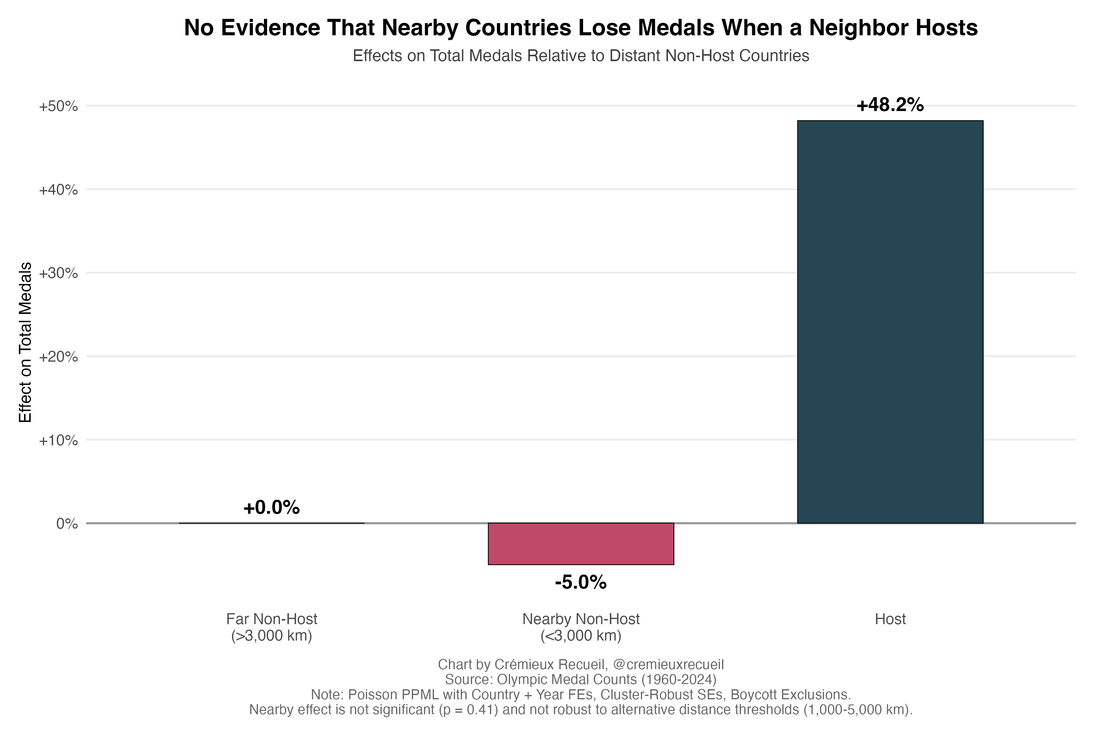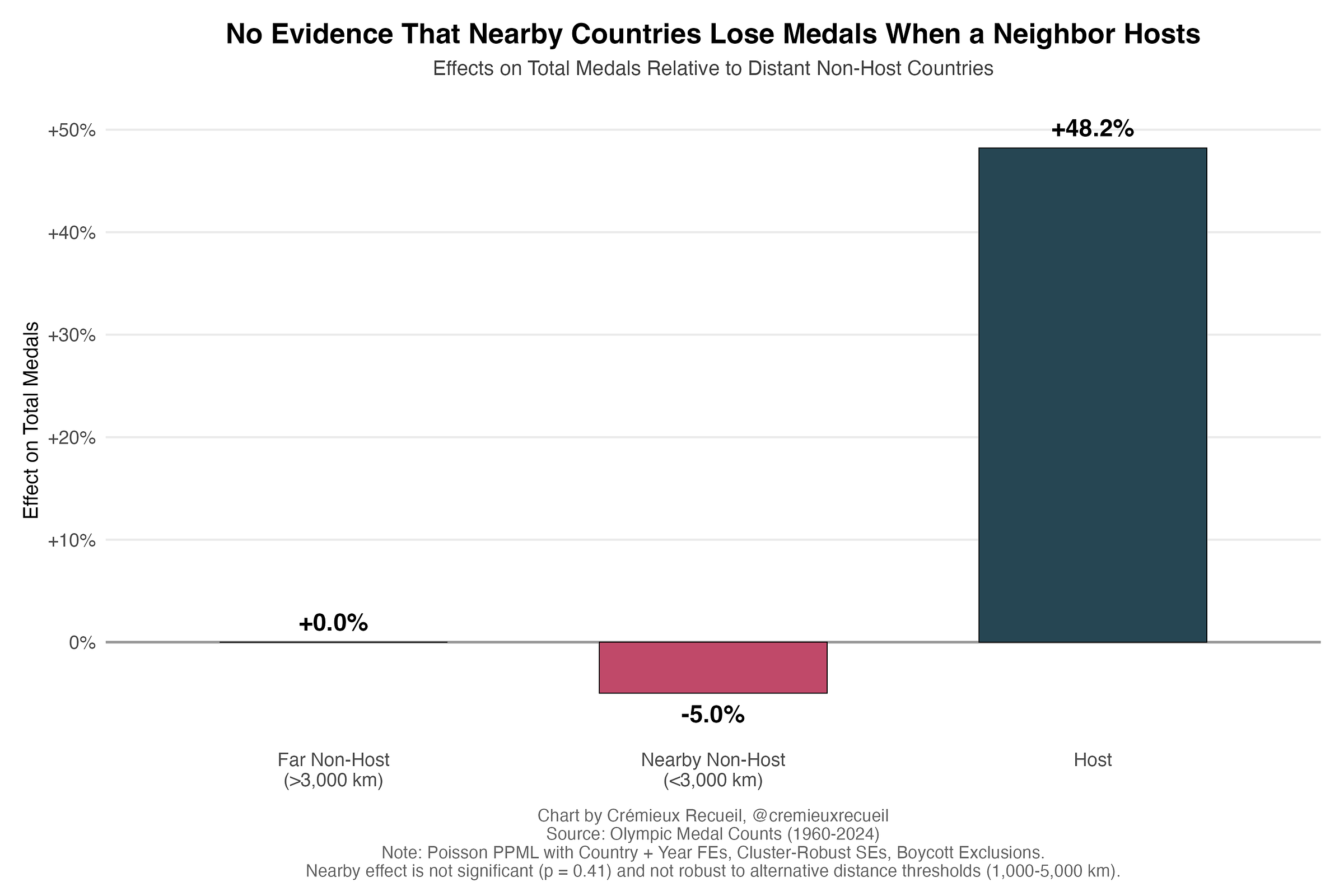 There’s also not some sort of distance-related cultural spillover effect, where nearby countries who host draw medals from countries that near them that might practice in similar sets of sports.
