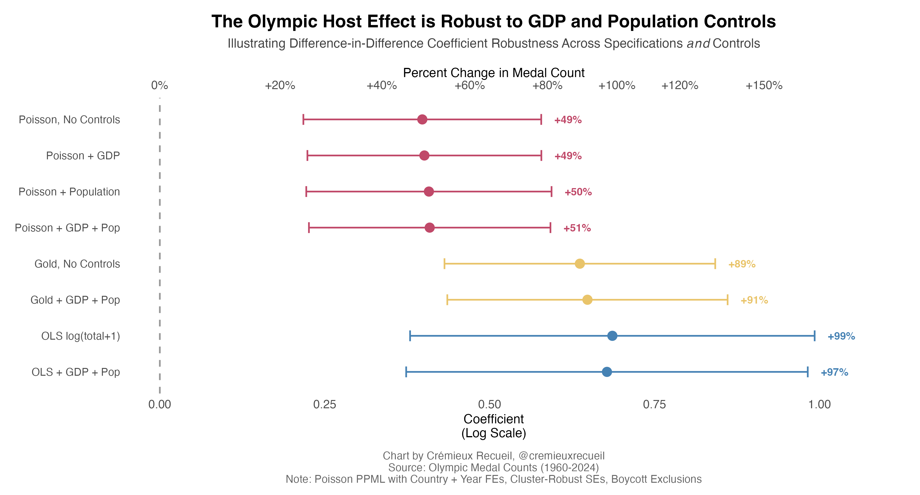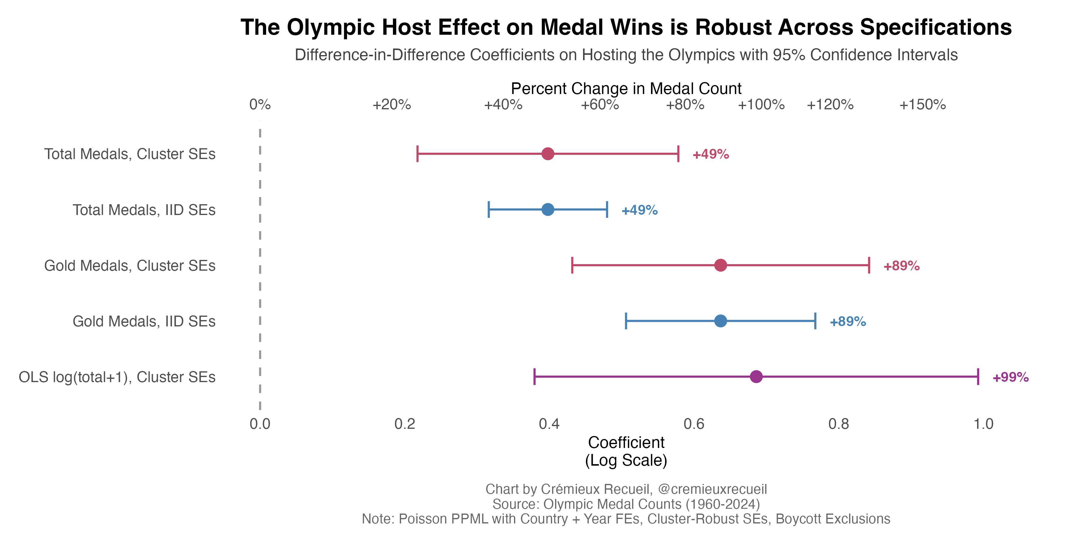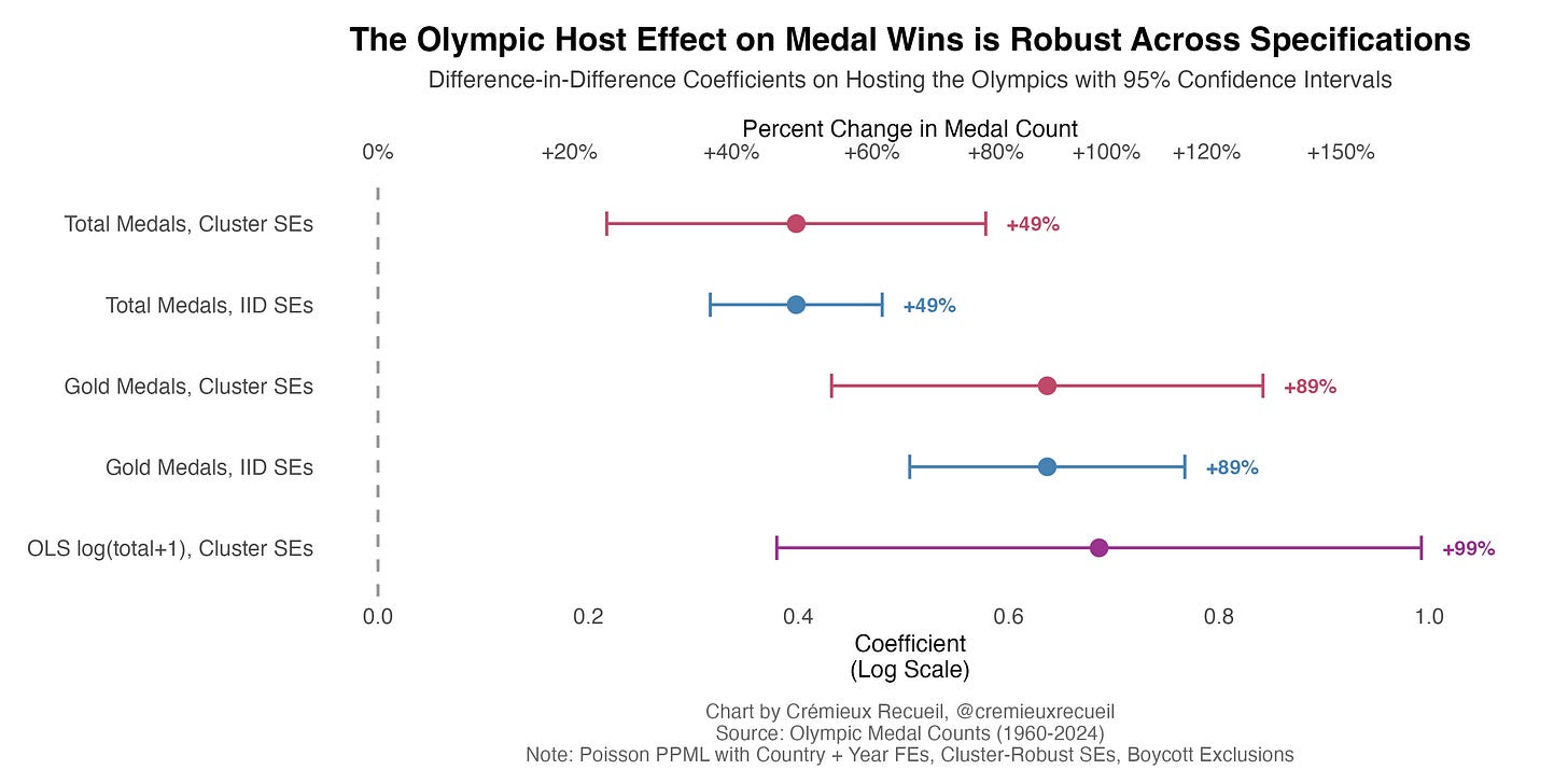To start, we’ll look at the difference-in-differences effect of hosting on winning medals: