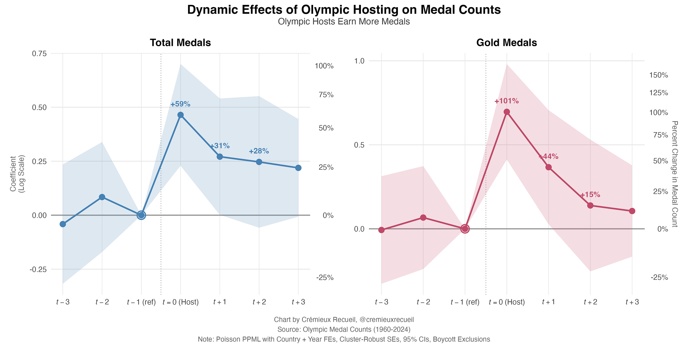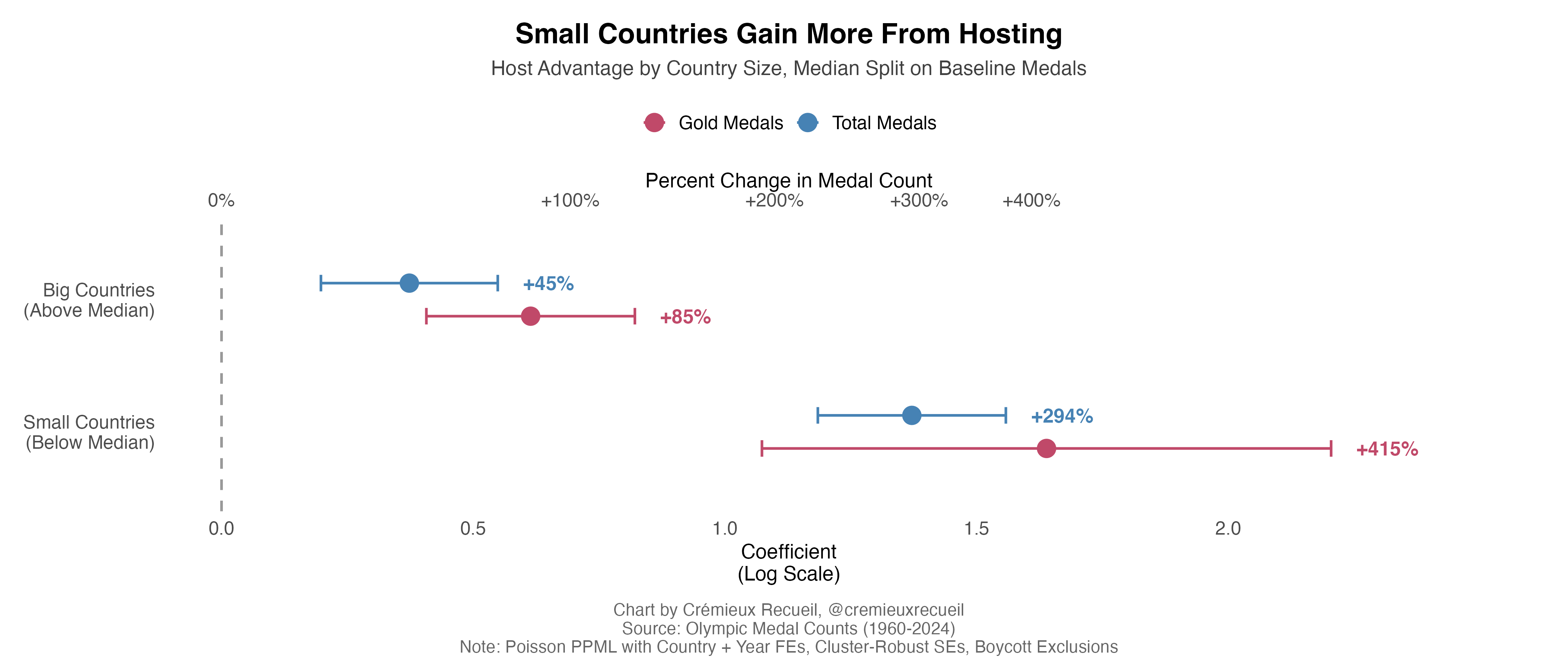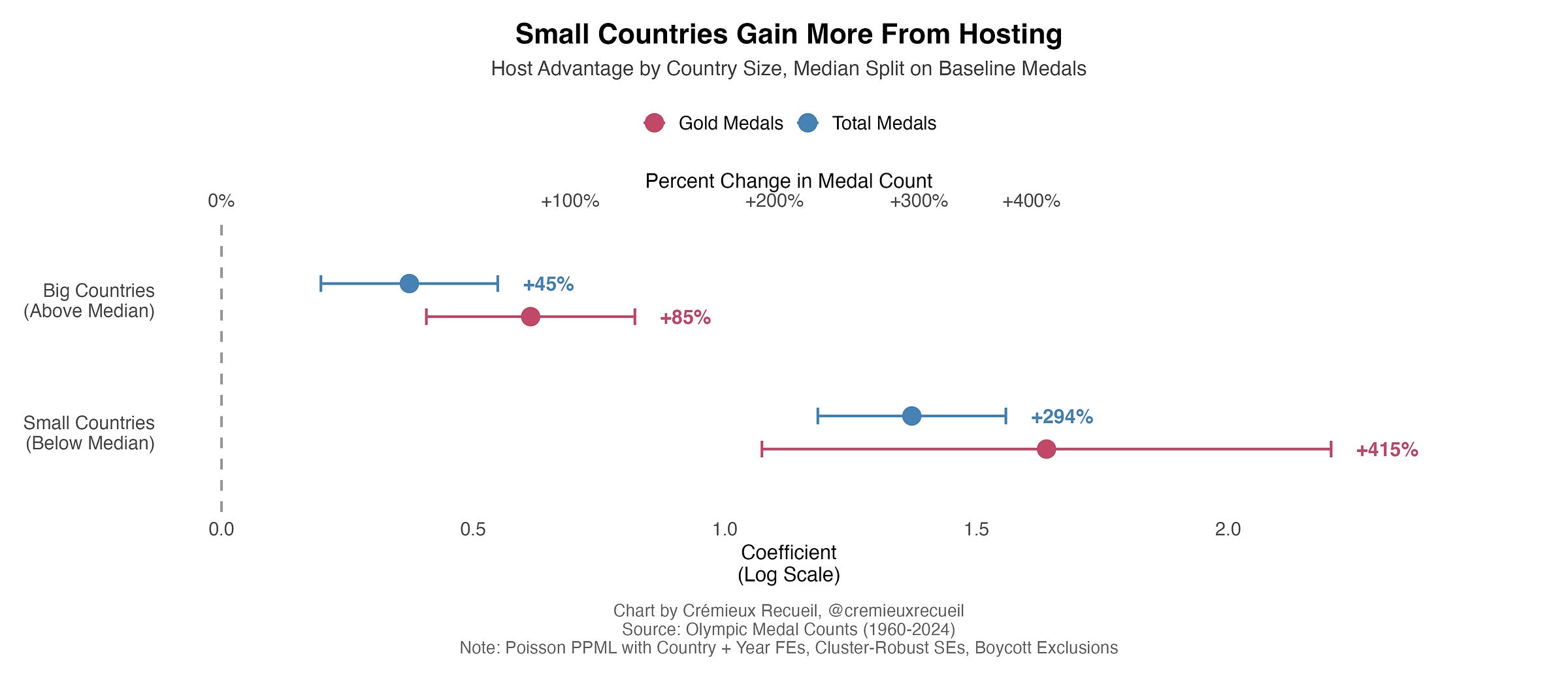 To start, we’ll look at the difference-in-differences effect of hosting on winning medals: