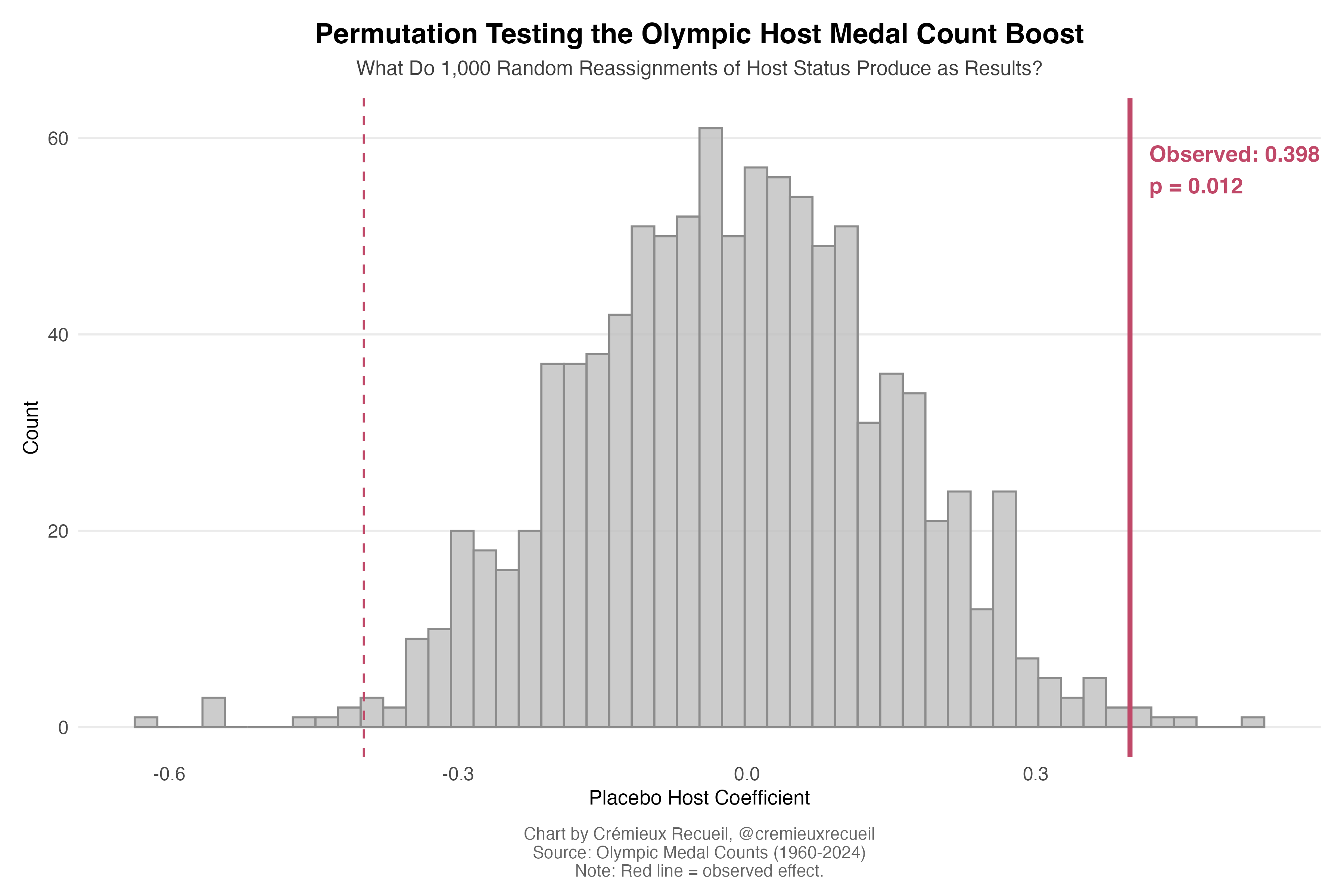 I will assume that every reader is familiar with what the Olympics are, and I’ll endeavor to explain something interesting about them: host advantage. As it turns out, the Olympics do not seem entirely fair; hosting countries have notable advantages: they win more medals and take home a higher share of the prestigious golds! Why this is has always been mysterious. Visually, the host advantage looks like:1