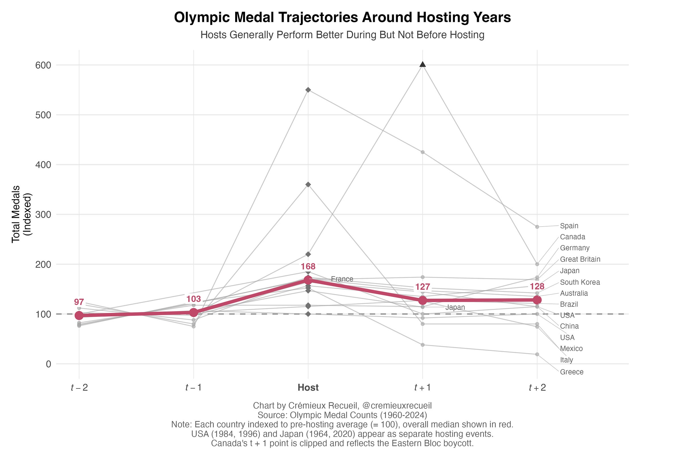Note: my analysis only concerns the Summer Olympics, and only modern years (c. 1960-2024), with the boycott countries excluded.