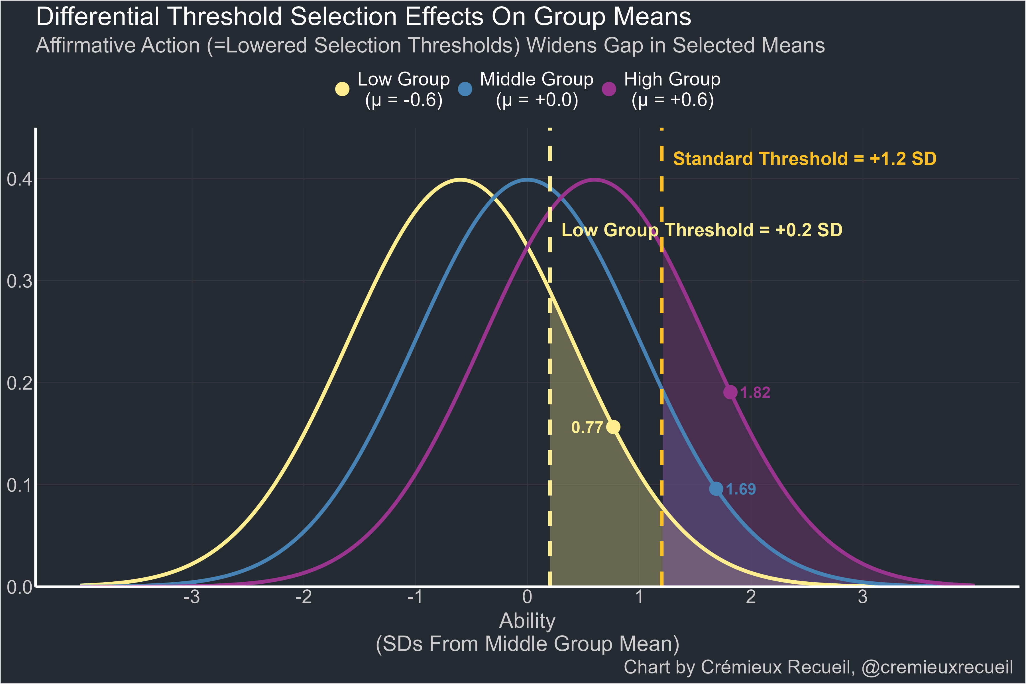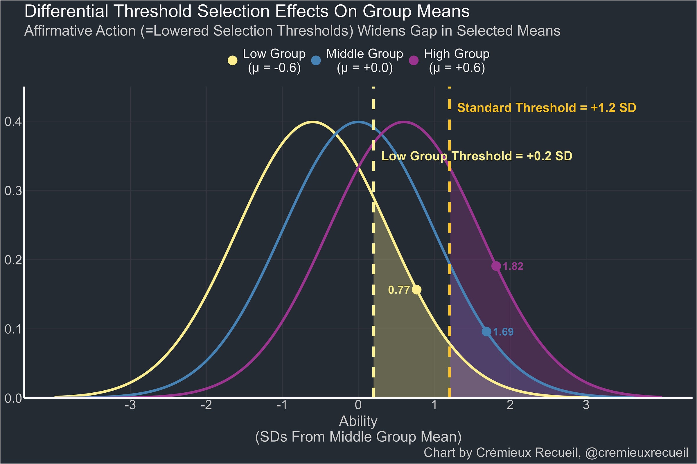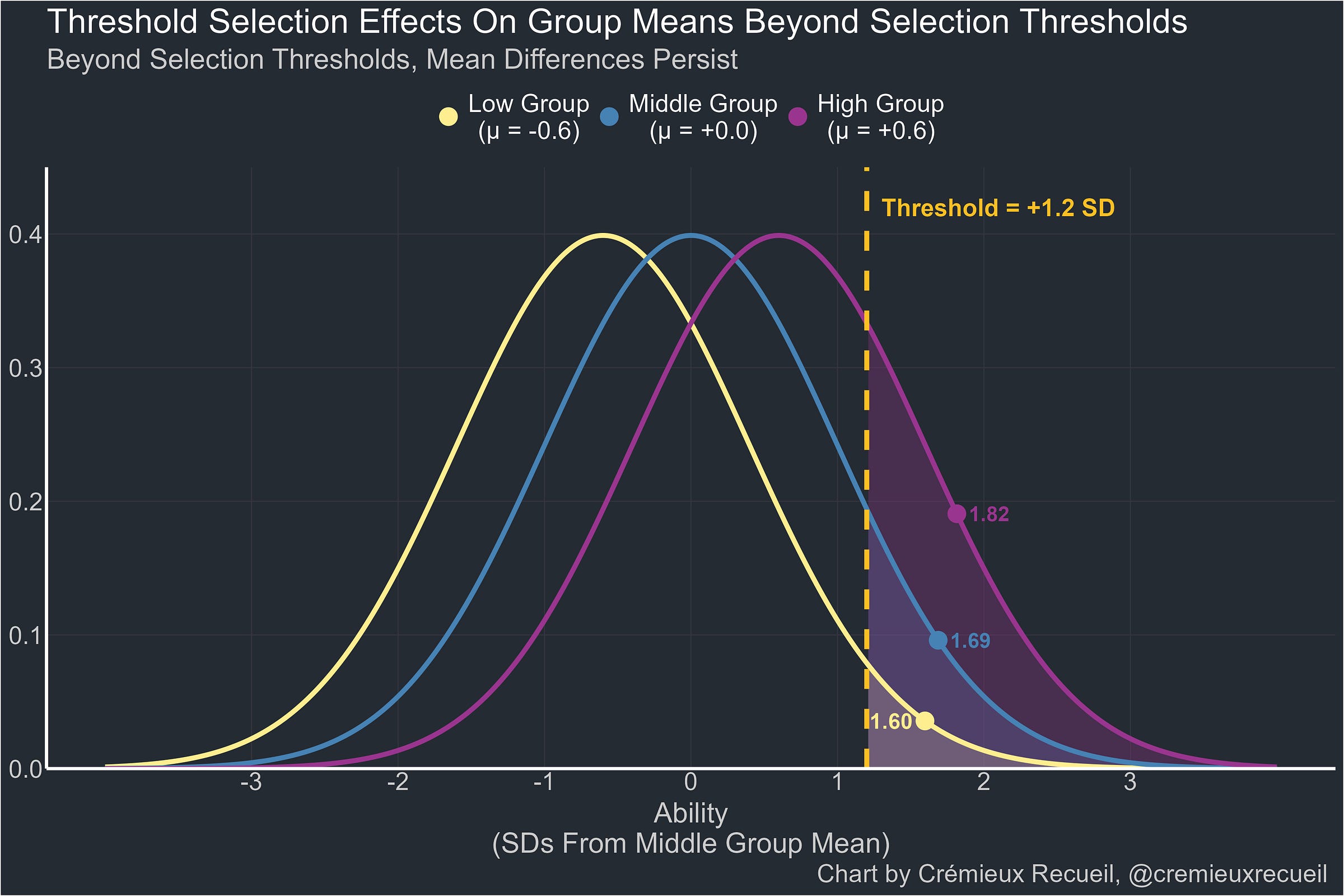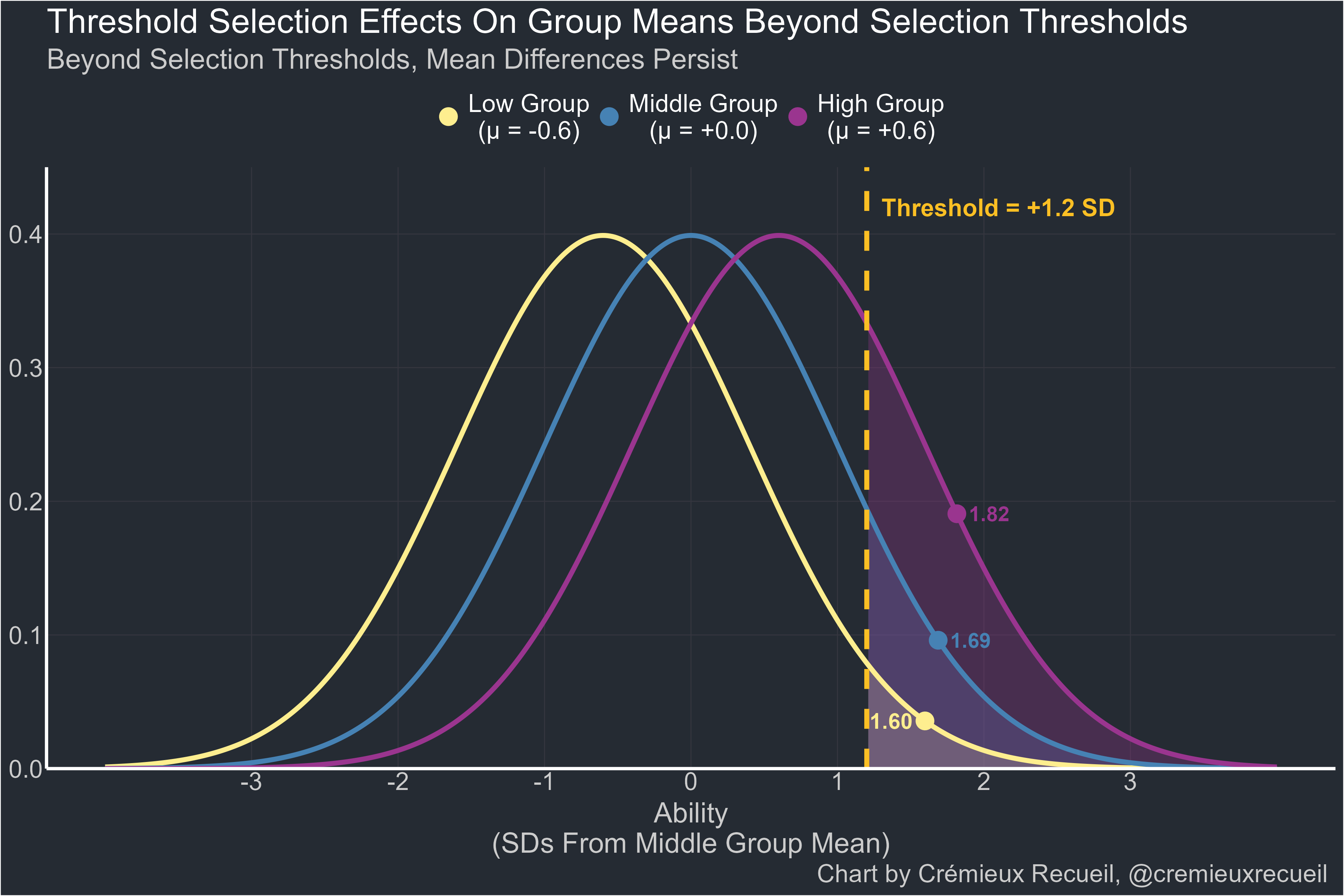 Consider three groups with normally distributed ability with equal variance, who only differ in mean ability level by 0.6 standard deviations on either side of the middling group. Members of these groups will be “selected” if their ability level is 1.2 standard deviations above the mean of the middling group. The means for the groups above this ability threshold are shown with dots on the lines in this diagram: