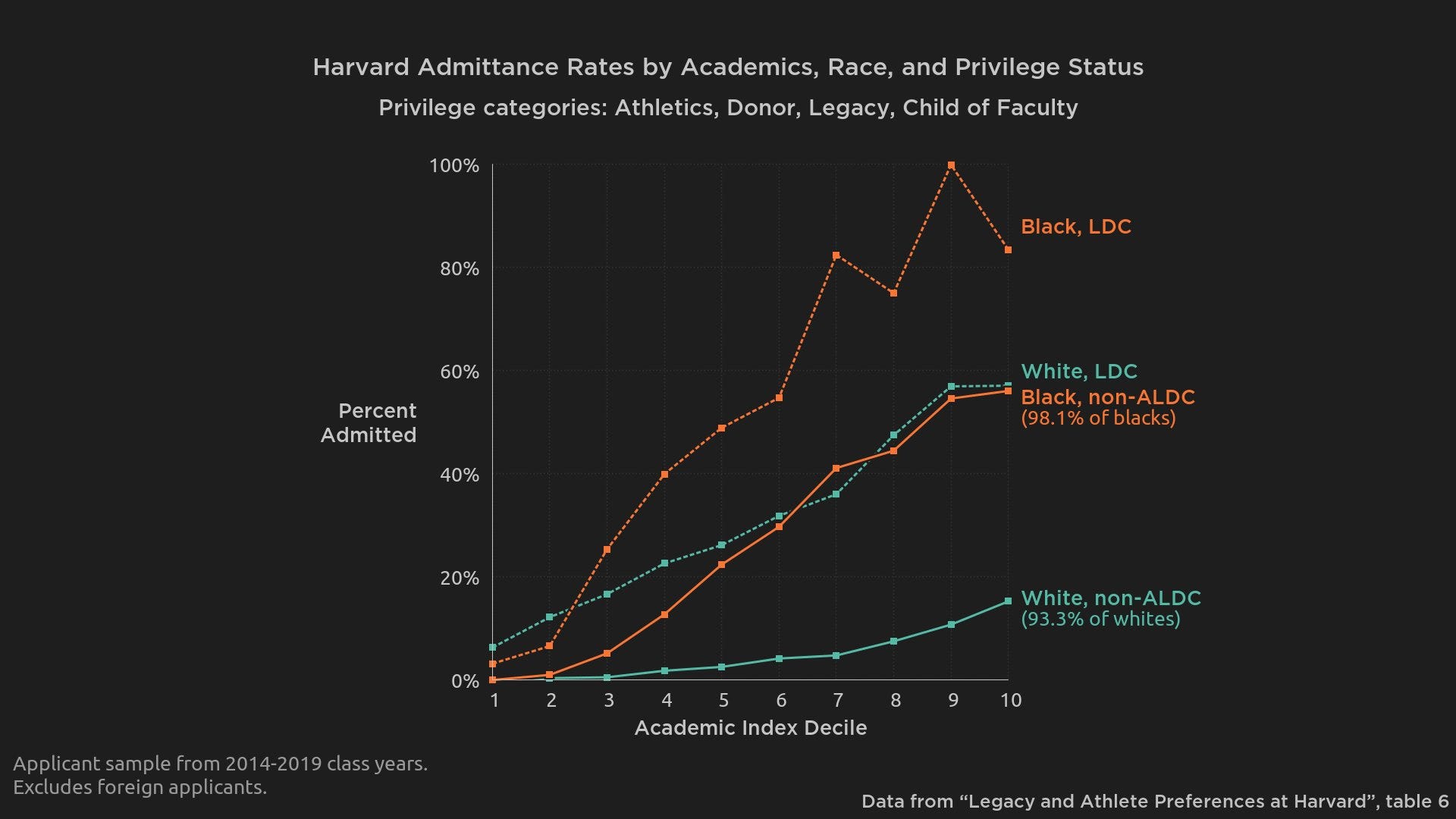 In the real world, this means that racial discrimination against Black professionals is justifiable if you want to receive the highest quality care in settings impacted by affirmative action. Leveraging data from the SFFA v. Harvard case, we can see how this turns out: at each level of academic qualification, Black students were substantially more likely to be admitted compared to Whites. Couple this with the fact that almost everyone who’s admitted eventually graduates from Harvard, and you wind up with a large affirmative action-driven racial performance gap among graduates. Thanks to the wonders of courtroom disclosure, we know that the gap in qualifications at Harvard is actually considerably larger than what I simulated above. Thanks to admissions data exfiltrated from Columbia and NYU, as well as a court case against the U.S. Naval Academy, and comparisons with other universities like the Ivy-11 or just Yale, we know this holds in many other places too.