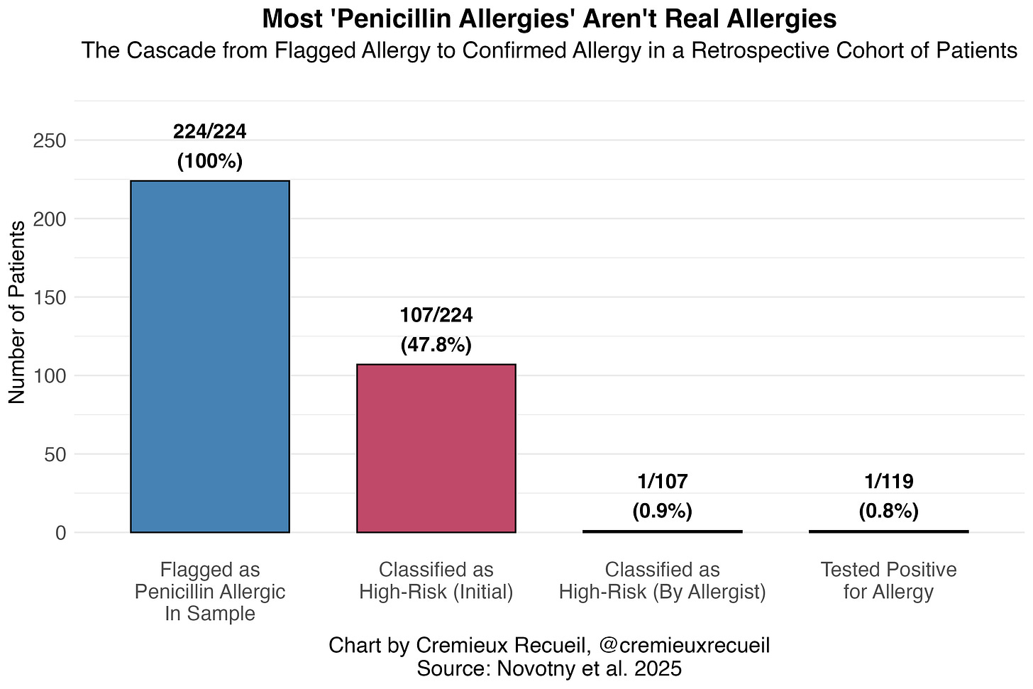 Consider this result for the commonly prescribed antibiotic penicillin: about half of the people flagged as having penicillin allergies in their electronic health records were classified as high-risk, but only one person looked high-risk on allergists’ review, and just one actually tested positive for their allergy!